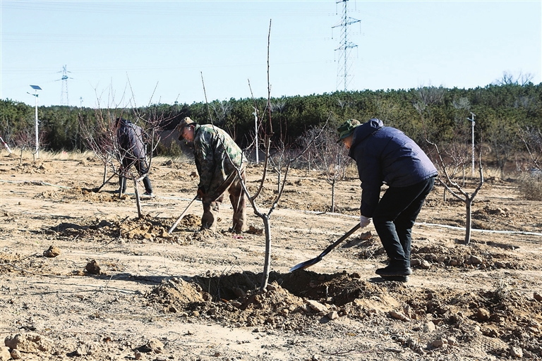 11月29日,太原市杏花岭区中涧河镇东坪村,果农正在进行土壤深翻,帮助桃树顺利越冬,为来年丰收打下基础。