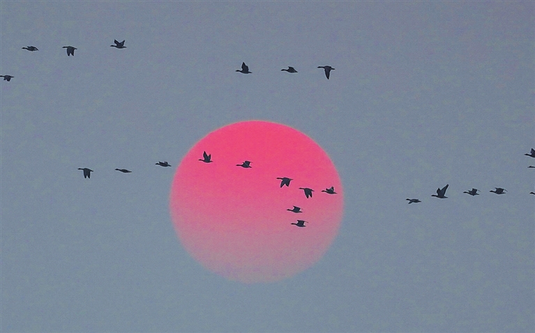 候鸟在南昌高新区五星白鹤保护小区翱翔(12月4日摄)。