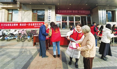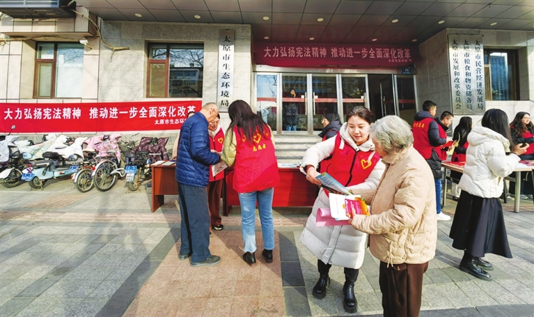 以“大力弘扬宪法精神,推动进一步全面深化改革”为主题,市生态环境系统推出形式多样的宣传活动:分布在市区的4块显示屏在“宪法宣传周”同步开启,轮播有关宪法和环境保护法律的宣传标语,吸引了众多市民驻足观看;迎泽分局围绕今年的活动主题,开展宪法“进机关”活动,组织干部职工认真学习习近平法治思想、《中华人民共和国宪法》《中华人民共和国民法典》等法律知识;尖草坪分局在多福广场组织志愿者,现场发放宣传资料以及环保手提袋;古交分局通过发放宣传手册、设置咨询台、摆放宣传展板等形式,向社会群众宣传宪法精神……