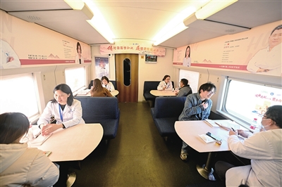 12月8日,医疗专家为旅客提供健康咨询。当日,在G8388次长三角超级“环线”列车由上海站驶往南京南站的旅途中,中国铁路上海局集团有限公司联合启航新健康博士团开展“健康启航长三角,紫金伴行到万家”义务健康咨询活动。来自上海长海医院、仁济医院、华山医院等三甲医院的8名专家为旅客提供肾内科、心内科、消化内科、内分泌科等多个领域的医疗咨询,受到欢迎。新华社记者 季春鹏 摄