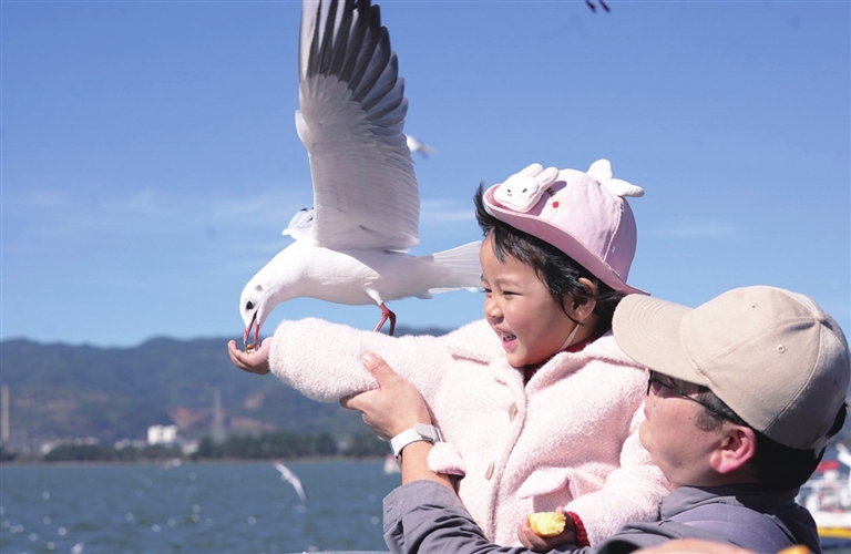 远眺山峦叠翠,近看碧波荡漾……冬日时节,云南昆明滇池国家旅游度假区的草海湖滨生态湿地,湖水清澈、鱼儿畅游,游客在步道上悠闲散步。