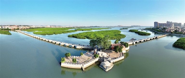 泉州市在2017年提出生态连绵带概念,以山水林田湖草统筹治理系统观,打造“山为骨、水为脉,林田湖草为肌体”的山水田园城市。作为生态连绵带建设先行示范的泉州海丝生态公园,被贯穿而过的百崎湖水系分为两个园区,打造形成山、水、林、田、塘、湿地为一体的生态景观综合体。