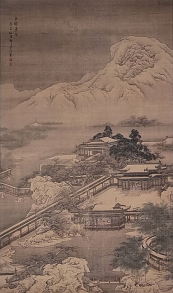 刘武喜好招揽门客。当时的梁园中聚集着枚乘、司马相如等一批著名文人。他们与梁孝王酬唱应答,留下了不少优秀的诗赋作品,汇成了所谓的“梁园文学”。梁孝王礼贤下士的故事迎合了中国传统文人的“知遇”理想,因此后代的文人墨客,经常借描绘梁园中的景致与活动,来表达对独具慧眼“主公”的歌颂与期盼。袁江这幅《梁园飞雪图》就是其中比较上乘的一件作品。图画描绘了梁园的雪景:庭院里的假山、房屋、回廊以及院外远处的山峦,都覆盖着皑皑白雪,透出一片寒意。而画中的人物,或在廊下散步,或在庭中歌舞,或在屋内饮宴,热闹的情形恰好和寒冷的环境形成了对比。