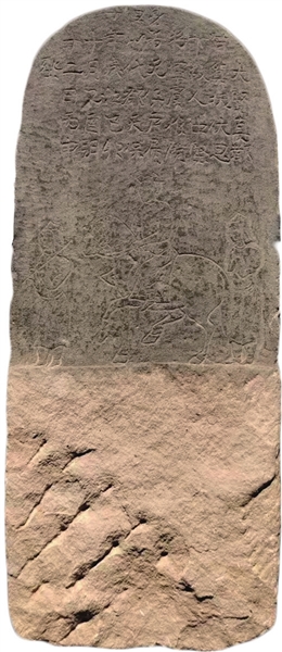 铭文下部为线刻图,题材是一主人二侍者,均面朝此墓志石的右侧方向。居中者骑一匹膘肥体壮的高头大马,长圆脸型,头戴巾,着右衽袍服、短靴,手持缰绳。马匹做日常前行状,刻出马鞍、马镫。马鞍上似插一长杆物品。前后各一名侍者,戴风帽、着袍服、短靴。马前侍者肩扛一杆。此类线刻图在墓志中出现较为罕见,是当时的日常生活出行场景题材。