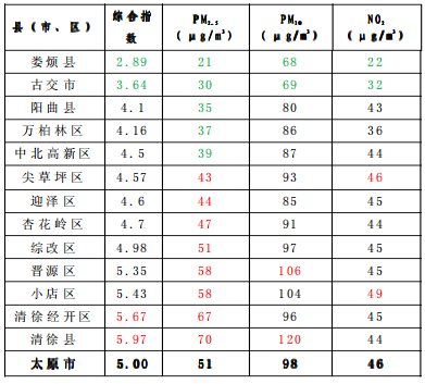 1.综合指数、PM10和NO2指标排名前两位的标为绿色,排名后两位的标为红色;
