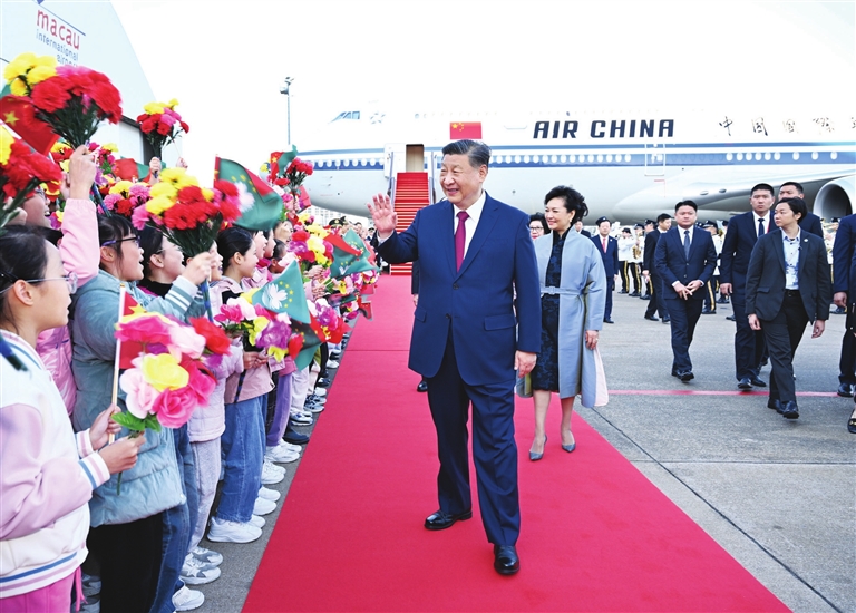 16时许,习近平乘坐的专机徐徐降落在澳门国际机场。习近平和夫人彭丽媛走出舱门,向欢迎人群挥手致意。澳门警察乐队奏响热情洋溢的欢迎曲,舞龙舞狮表演喜气欢腾。舷梯旁,两名少年儿童向习近平和彭丽媛献上鲜花。在澳门特别行政区行政长官贺一诚和夫人郑素贞陪同下,习近平和彭丽媛同前来迎接的人员亲切握手。数百名澳门青少年和各界群众代表挥动国旗、特别行政区区旗和鲜花,表达热烈的欢迎。