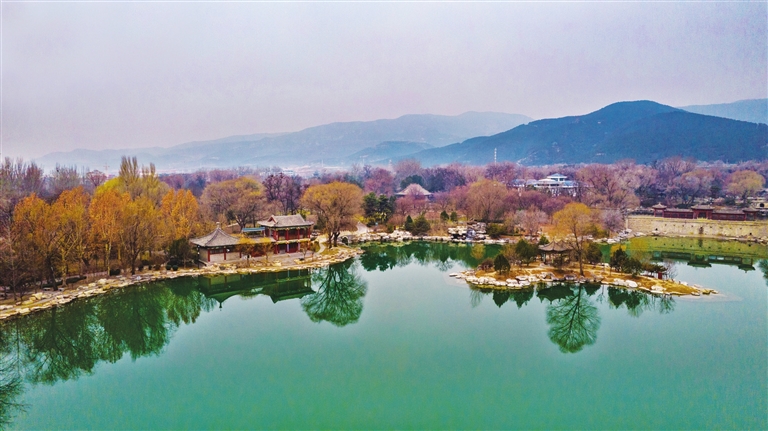 十二月二十二日,俯瞰冬日里的晋祠公园,古朴典雅的亭台楼阁与湖水构成一幅别具韵味的山水画。王韵菲 摄