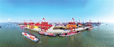 这是12月24日拍摄的江苏省扬州港集装箱码头(无人机全景照片)。临近年底,各地生产企业、物流枢纽一派繁忙景象,奋力冲刺全年目标任务。新华社发(孟德龙 摄)