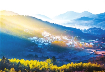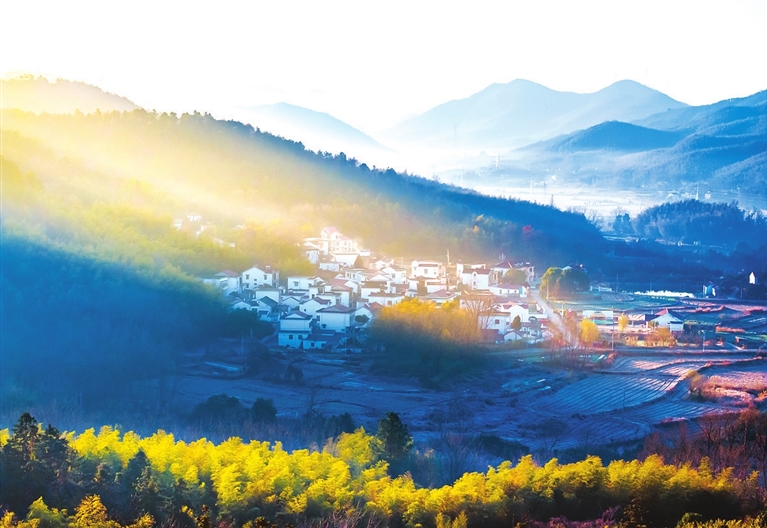 12月29日在安徽省芜湖市繁昌区峨山镇城东村拍摄的乡村晨景(无人机照片)。