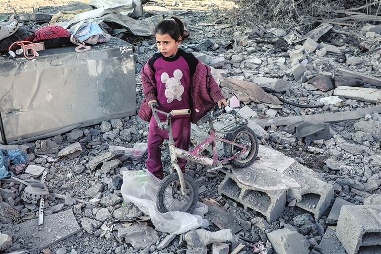 1月3日,在加沙地带中部迈加齐难民营,一名女孩站在废墟中。巴勒斯坦加沙地带民防部门发言人马哈茂德·巴萨勒3日说,以色列军队2日至3日夜间密集轰炸加沙地带多地,造成至少42人死亡。新华社发