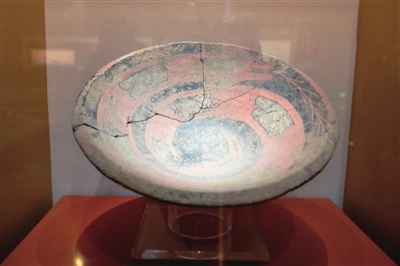 展柜内一块白灰墙皮吸引了游客目光,上面刻画着由圆圈、直线、折线构成的几何图案。