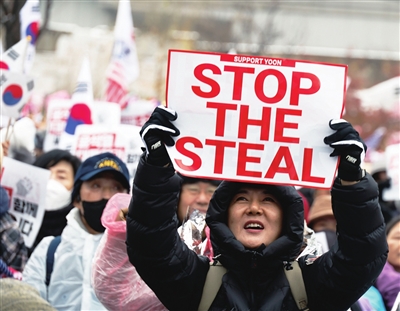 1月5日,尹锡悦支持者在位于韩国首尔的总统官邸附近参加集会反对逮捕总统尹锡悦。韩国总统警卫处长朴钟俊5日发表声明说,在逮捕令执行存在司法程序争议的情况下,总统警卫处若配合执行逮捕令,无异于放弃总统警卫职责,构成失职。新华社发(全休相 摄)