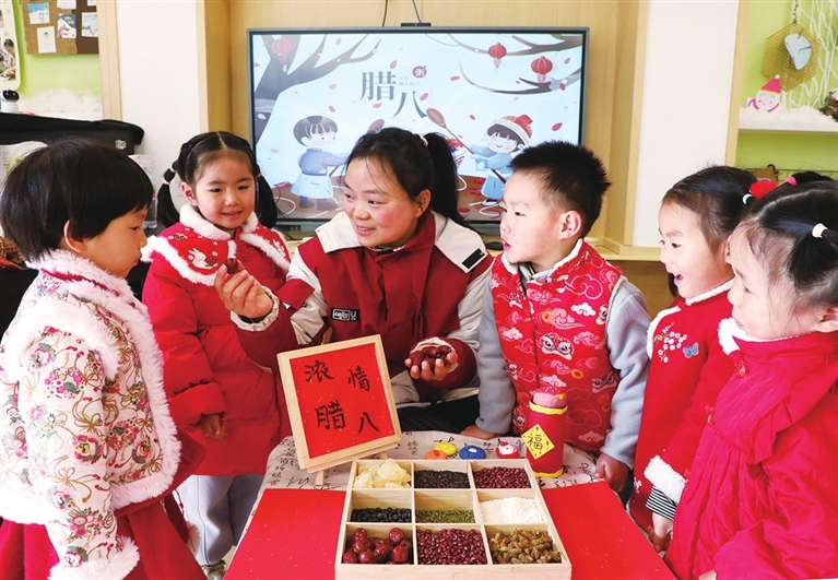 1月6日,在江苏省苏州市姑苏区平润实验幼儿园,老师在教小朋友认识制作腊八粥的食材。
