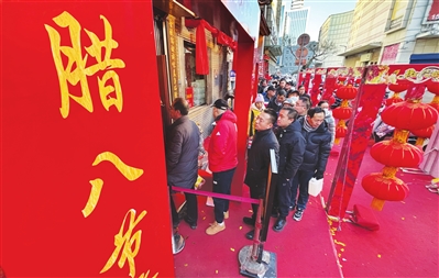 1月7日,农历腊月初八,老字号益源庆店门前排起打醋长队,市民们用老陈醋腌一罐腊八蒜,享受浓浓的年味儿。邓寅明 摄