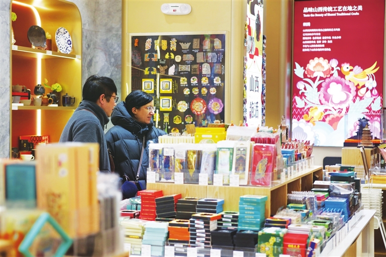 太原文旅市场持续火爆,相关文创产品受到消费者欢迎。1月7日,一名外国游客在钟楼街“晋礼”文创商店内选购文创产品。