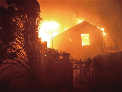 驾车冲过“火星雨”,来到野火肆虐的中心地带。风大得让人无法站稳,到处是呛人的浓烟。火星四处飞溅,落在易燃物上再引发熊熊烈焰。附近房屋一幢接一幢地燃烧起来,赶来的消防车也因火势太猛,仅洒了些水便放弃了与野火的对峙。