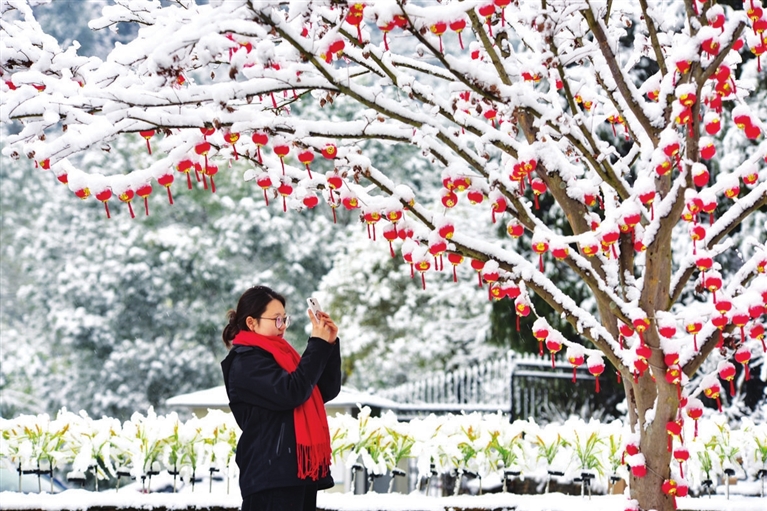 1月9日,游人在重庆市酉阳土家族苗族自治县桃花源国家森林公园欣赏雪景。近日,受冷空气影响,多地迎来降雪天气。新华社发(邱洪斌 摄)