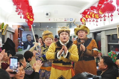 当日,在哈尔滨开往漠河的K7041次列车上,五名鄂伦春族非遗文化传承人为旅客展示桦树皮烫画、面塑、刺绣等非遗项目。据了解,这是中国铁路哈尔滨局集团有限公司开行的首趟民族非遗文化列车。新华社记者 王 松 摄