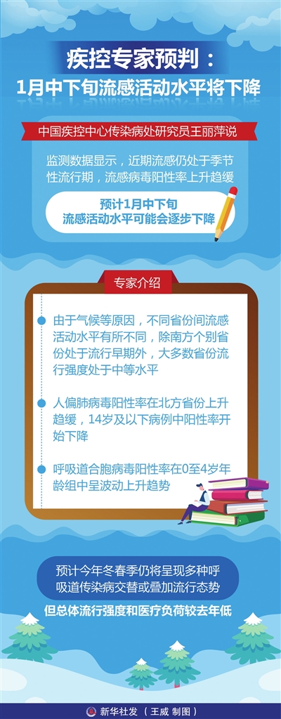 “监测数据显示,近期流感仍处于季节性流行期,流感病毒阳性率上升趋缓,预计1月中下旬流感活动水平可能会逐步下降。”中国疾控中心传染病处研究员王丽萍说。