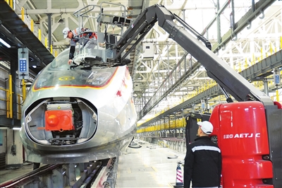 1月12日,中国铁路太原局集团有限公司太原车辆段太原动车组运用所内,工作人员正在对高铁列车进行检修、维护、全方位排障,确保春运期间列车运行安全。王韵菲 田国伟 摄影报道
