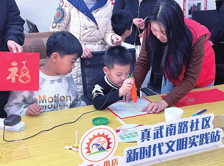 活动开始前,社区工作人员向孩子们讲解拓印画的发展历史,并给每个人发放了制作工具。孩子们认真地将刻有吉祥图案或文字的纸膜覆盖在红纸上,一手按住红纸,一手用拓印刷蘸取颜料,缓缓点涂。不一会儿,一幅幅寓意吉祥、充满新年气息的年画便呈现在眼前。