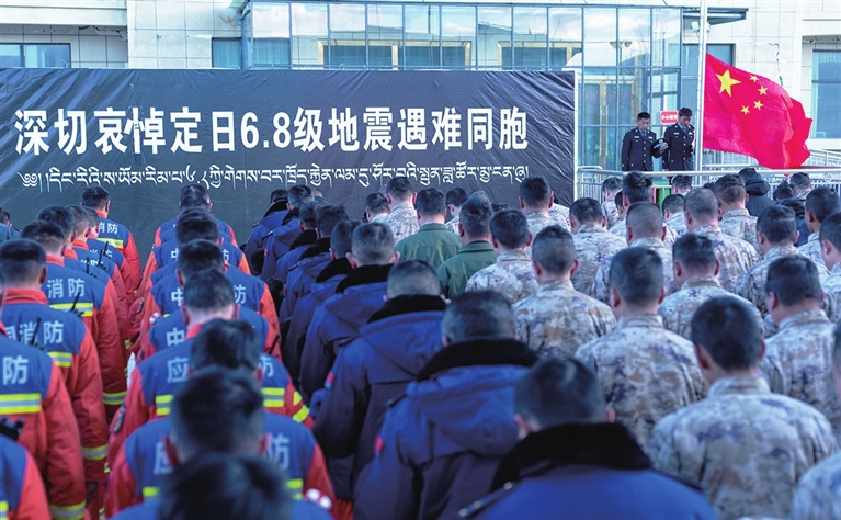1月13日上午9时30分,西藏定日6.8级地震遇难同胞悼念仪式在受灾最严重的长所乡举行。参与救援的解放军和武警官兵、消防救援人员、公安民警、医护人员、青年志愿者及有关企业员工、干部职工、震区群众代表数百人,脱帽肃立,向遇难同胞默哀3分钟。新华社记者 丁增尼达 摄