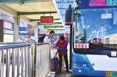 在太原南站公交站台,志愿者在帮乘客搬运行李。