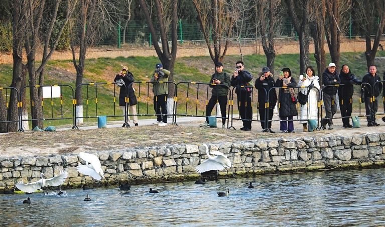 1月13日,汾河景区湿地公园内,涉禽在游人们的注视下翩然起舞,觅食嬉戏,构成一幅人与自然和谐相处的生态画卷。郭苑甫 摄