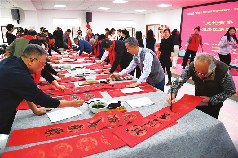一月十四日,“灵蛇贺岁 春联送暖”迎泽区送春联进社区公益活动在青年路二社区举行。书法家们挥毫泼墨,为辖区居民送上溢满年味的春联。牛利敏 摄