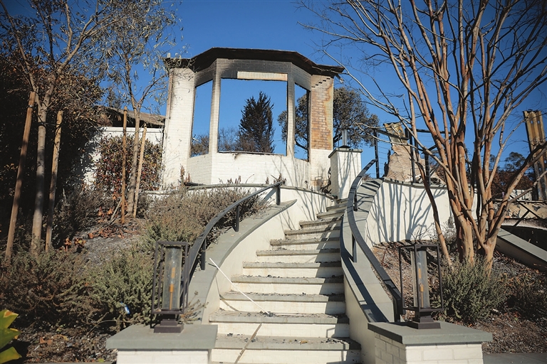 这是1月15日在美国加利福尼亚州洛杉矶拍摄的在“帕利塞兹”山火中烧毁的帕西菲克帕利塞兹社区的房屋。