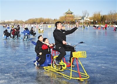 1月19日上午,在北京什刹海冰场,小朋友和家长一起体验冰上运动。当日上午,北京天气晴好,许多游客来到什刹海冰场体验冰车、冰上自行车等运动游乐项目,乐享冰趣。新华社记者 张晨霖 摄