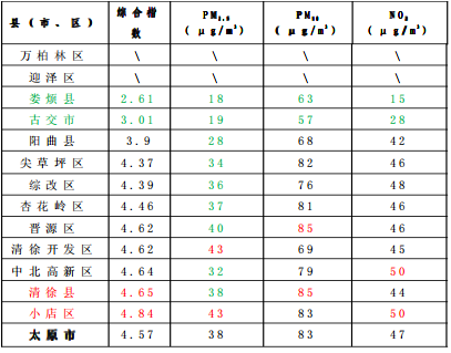 1.综合指数、PM10和NO2指标排名前两位的标为绿色,排名后两位的标为红色;