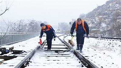 1月25日,西山煤电铁路公司职工以雪为令,重点清扫道岔尖轨、滑床板、转辙机等部位积雪,有效防止道岔积雪结冰造成卡阻现象发生,确保能源保供行车运输安全。张秀丽 摄