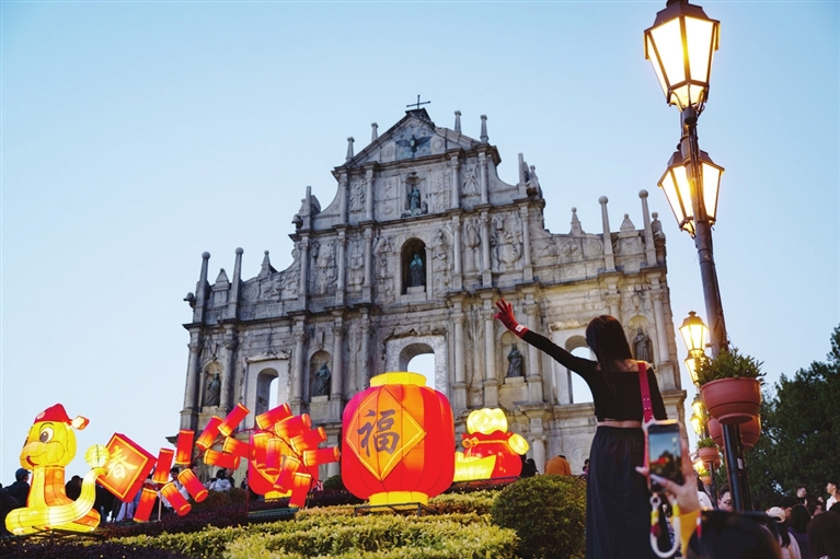 1月25日在澳门大三巴牌坊前拍摄的春节灯饰。春节临近,澳门特区市政署在澳门各区布置“金蛇贺岁喜迎春”主题的贺年灯饰,营造浓厚的过年节庆氛围。新华社发 (张金加 摄)