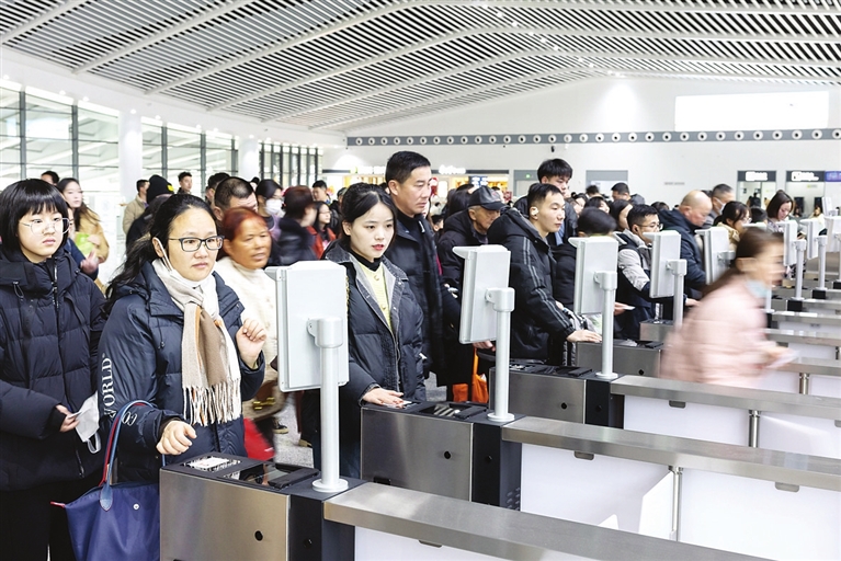 在北京朝阳站,站内大厅宽敞明亮、张灯结彩、年味浓郁,旅客拎着大包小包,喜气洋洋地踏上返乡路。前往哈尔滨的李冬宇,走出北京地铁3号线,沿地面“彩虹指路带”行进不到2分钟,迎面就是铁路安检口。“丝滑”进站,让他感到顺畅、舒心。