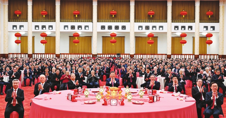 人民大会堂宴会厅灯光璀璨、暖意融融,各界人士2000多人欢聚一堂、共迎佳节,现场洋溢着欢乐祥和的节日气氛。