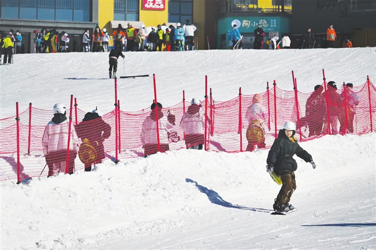 1月26日,随着气温降低,省城各大冰雪游乐场游客增多,雪地运动升温,图为太原市采薇庄园滑雪场内,游客在雪道上驰骋。郭苑甫 摄