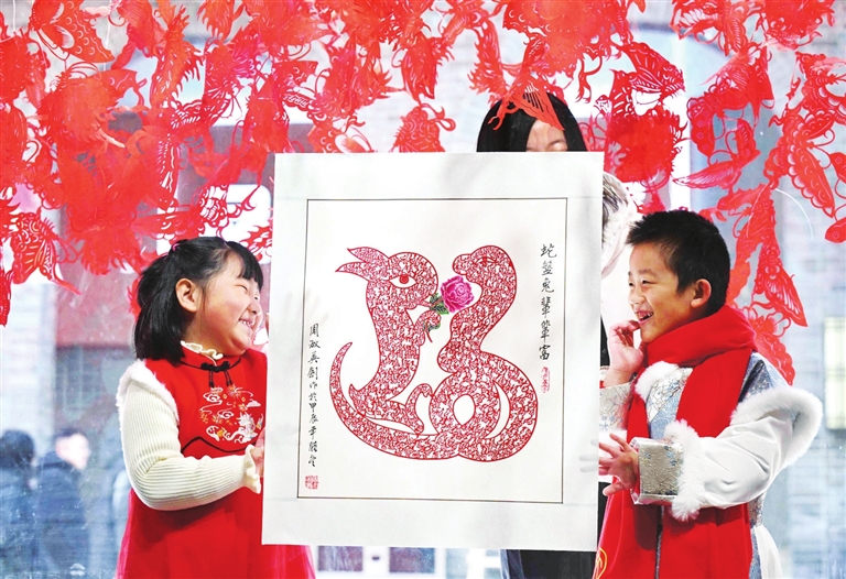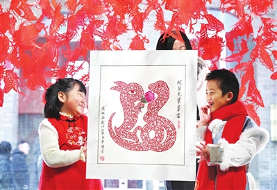 1月27日,小朋友在河北省石家庄市新华区欣赏迎新春剪纸作品。