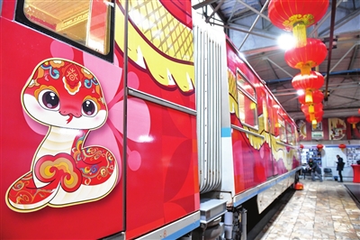 这是1月29日在俄罗斯首都莫斯科拍摄的春节主题地铁列车。当地时间29日下午1时30分许,一列红色列车缓缓驶出莫斯科伊斯梅洛沃地铁车库,标志着莫斯科地铁春节主题列车成功发车。新华社发(亚历山大 摄)