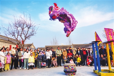 1月30日,山西省运城市盐湖区岚山根景区在进行民俗舞狮表演。新春佳节期间,人们以丰富多彩的形式乐享假期。新华社发(姜 桦 摄)