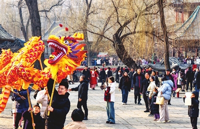 春节期间,我市各个景区丰富多彩的活动吸引了游人前往感受年味。2月1日,晋祠博物馆内,游人参与舞龙。韩双喜 摄