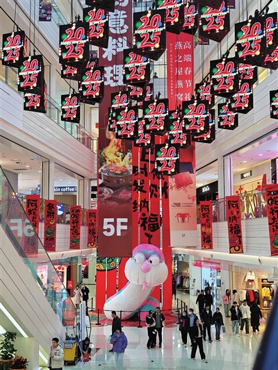 2月2日,迎泽西大街某大型商场内,各种新春装饰营造了热闹喜庆的节日氛围,吸引顾客消费购物。郭苑甫 摄