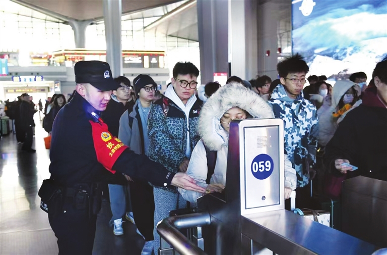 二月四日,太原南站派出所的民警正在指导乘客有序进站,确保春运期间旅客的出行安全。牛利敏 摄
