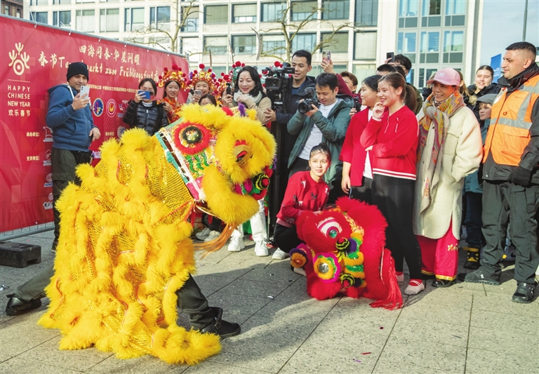紧接着,安塞腰鼓队登场。鼓槌翻飞间,激昂鼓点在广场上空回荡,舞者将黄土高原的热烈奔放“带到”莱茵河畔,挥洒出春节的喜庆气氛,让人热血沸腾。