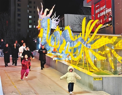 2月4日晚,泰享里新经济产业园张灯结彩,市民们携亲带友观赏花灯,感受浓浓年味儿。郭苑甫 摄