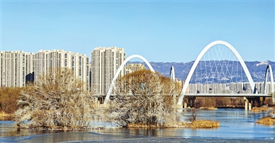 二月五日,在北中环桥湿地公园附近,受降温影响,河中心的树木出现雾凇现象。当日,市气象台发布大风蓝色预警,平均风力四至六级,阵风可达七级以上。郭苑甫 摄