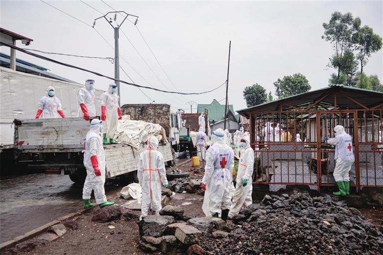 2月5日,在刚果(金)北基伍省首府戈马市,工作人员转移遇难者遗体。刚果(金)政府3日说,刚果(金)政府军与反政府武装“M23运动”在北基伍省首府戈马市的冲突已造成2000余人死亡。新华社发 (加 南 摄)