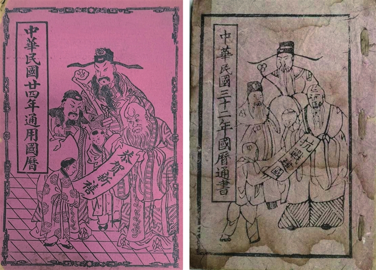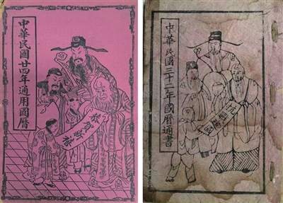 较为有代表性的是“抗战胜利”“抗战建国”取代了“恭贺新禧”。福禄寿是中国民间信仰的三位神仙,象征幸福、吉利、长寿,三位可画在一起,也可单独成画,是中国民间传统新年装饰品,寄托着劳动人民一种祈福求寿、避灾迎祥的美好愿望,后被赋予了家庭安乐、生活富足、风调雨顺、仕途得意、生意兴隆、出行平安,乃至天下太平、国富民安等众多含义。福禄寿三星出现在历书封面,现可见的最早版本是清中后期,20世纪初期已较为普遍,天官或寿星手中的条幅上,一般都是“恭贺新禧”四个字,1940年前后的部分民间历书封面中,“抗战胜利”“抗战建国”取代了“恭贺新禧”,显然是编辑借历书表达国民心中对国家战胜侵略者的希望和寄托,对和平美好幸福生活的渴望与追求。