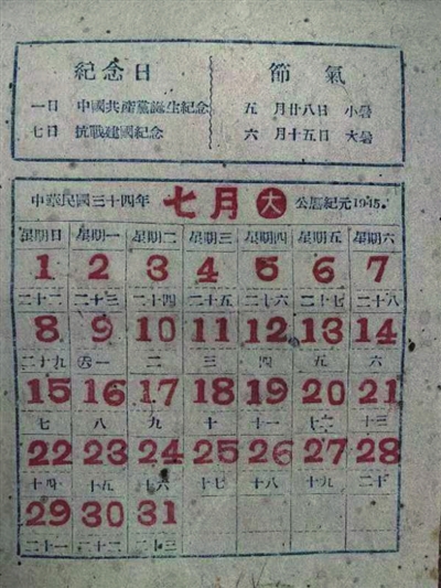 在抗战历书上还可以看到,9月18日九一八事变(1931)、1月28日上海闸北抗日纪念(1932)、8月13日上海惨案(1937)、7月7日七七事变(1937)等纪念日被特别标出注明。这些惨案和事变,是日本侵略者留给中国人民的悲痛记忆。在通信和传播极为落后的抗战时期,历书中记录的这些与抗战有关的纪念日,通过固有的传播渠道,经年累月与百姓接触,走入千家万户,在唤醒爱国热情、振奋抗战精神等方面发挥了独特作用。