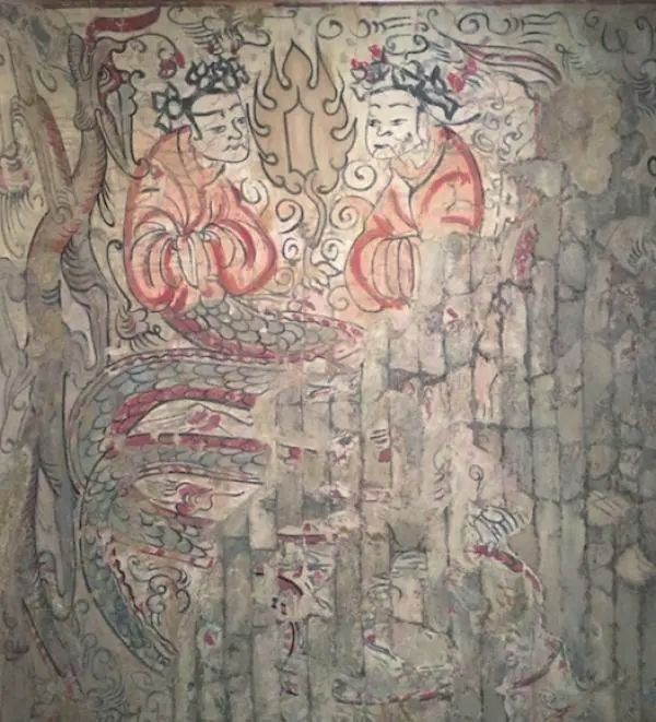 在大同市平城区沙岭村东北处,有12座北魏时期的墓葬。在这些墓葬中,一座编号为M7的砖室墓,曾轰动考古界,并入选了“2005年全国十大考古新发现”。这座墓的甬道顶部,绘有伏羲、女娲的形象,两人头戴花冠,双手放在胸前,下半身布满鳞纹,呈蛇尾状交缠在一起。两人中间有一围绕火焰纹的摩尼宝珠,象征着光明与吉祥。画面的两边各有一条龙尾上卷的长龙,龙头刻画清晰,左侧有破损。